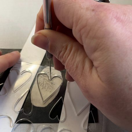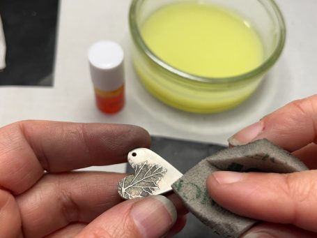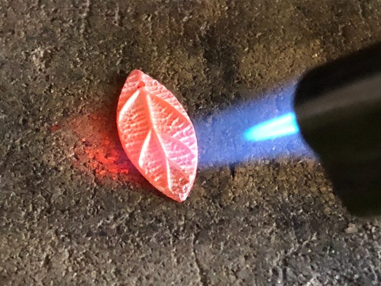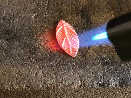 Wanneer je tevreden bent, kan je het afbakken tussen de 650 en 800 graden. Dat kan in een speciale oven of met een gasbrander. Tijdens het afbakken verbrandt het bindmiddel en de zilverdeeltjes smelten aan elkaar.